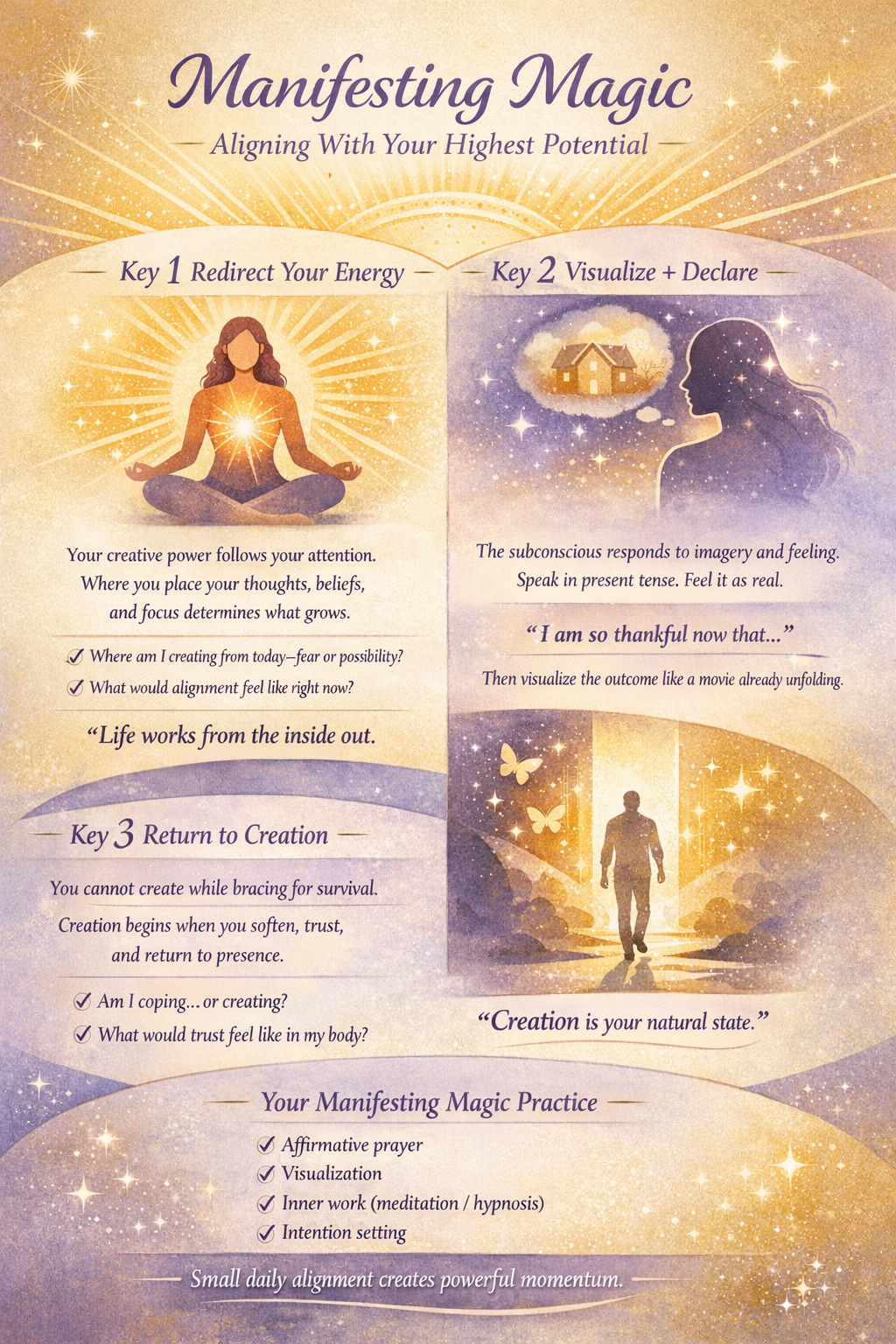 This isn’t just about learning manifestation techniques; it’s about awakening to the deeper currents that shape your reality. Through subconscious alignment, identity work, and focused awareness, you begin to understand the inner architecture of creation while strengthening your connection to your own source of guidance.